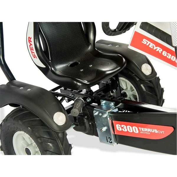 Ein weiteres Highlight ist die superdicke Pulverbeschichtung des Fahrzeugrahmens, die auch kleinere Unfälle verzeiht. Das DINO CARS Steyr BF3 hat eine robuste Kugelkopflenkung, mit der Du ganz easy durch jede Kurve cruisen kannst. Die Kette wird mittels des leicht zu bedienenden Kettenspanners einfach und bequem eingestellt. Der vollständig geschlossene Kettenkasten verhindert die Verletzungsgefahr und schützt die Kette vor unnötigen Verschmutzungen. Zusätzlich eingeschweißte Stahlverstärkungen in den Sitzhalterungen verhindern ein Ausschlagen der Sitzführung. Das ist DINO CARS Qualität, die sich beim Wiederverkauf auszahlt.