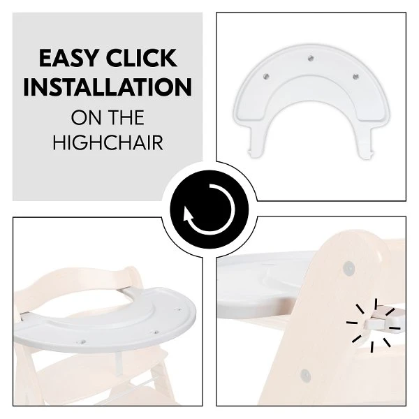 Das Play Tray kannst du mit einem Klick auf den Vorderbügel des Hochstuhls montieren und wieder abnehmen, wenn es nicht mehr benötigt wird. Die Holzspielaufsätze werden mit einer Holzschraube am Play Tray fixiert, sodass nichts verrutscht oder auf den Boden fällt. Das Spielbrett ist zusammen mit den Hochstuhlgurten verwendbar, sodass dein Kind auch beim Spielen sicher sitzt. Ab 12 Monaten geeignet.