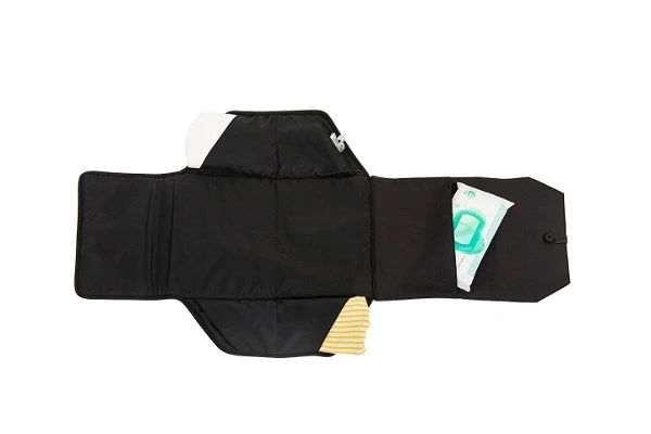 Die modische schwarze Unterlage hat vier praktische Taschen für Windeln und Tücher, eine herrlich weiche Polsterung für dein Baby und ist aus wasserfestem Stoff für eine einfache Reinigung.