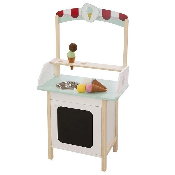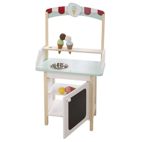 Der Roba Eisstand verfügt über verschieden Eiskugeln aus Plüsch welche die Geschmacksrichtungen Schoko, Vanille, Banane, Apfel oder Erdbeere sein können. Vorne an der Tür befindet sich eine Fläche aus Tafellack auf der die Preise stehen können und hinter der Tür befinden sich zwei Fächer zur Aufbewahrung. Der Eisstand ist in weiß und einem hellblau lackiert und seitlich mit je einem Stern versehen.