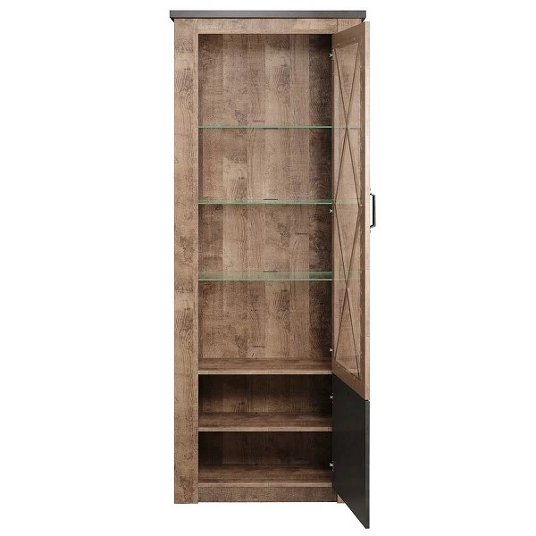 Die trendteam Georgia Standvitrine ist eine stylishe Lösung für Stauraum, ohne zu viel Stellfläche einzunehmen. Die verwendete Dekorfolie verschafft der Oberfläche Langlebigkeit. Das Design kennzeichnet der Korpus im Tabak Eiche und Matera Dekor, wodurch es fabelhaft zu Ihrem weiteren Mobiliar passt. Schwarzfarbene Griffe gliedern sich farblich hervorragend in das Dekor ein.